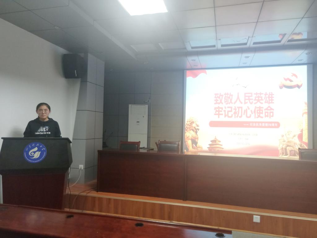田晶同志主讲了“致敬人民英雄,牢记初心使命——纪念抗美援朝70周年”主题微党课。田晶同志从抗美援朝大事记、抗美援朝意义、革命先烈永垂不朽和学习志愿军精神四个方面对抗美援朝战争进行了全面详细的阐述。习近平总书记在纪念中国人民志愿军抗美援朝出国作战70周年大会上指出:“抗美援朝战争的胜利,是正义的胜利、和平的胜利、人们的胜利。”抗美援朝战争的胜利不仅从根本上洗刷了百余年来中华民族受侵略的屈辱历史,重拾了失落已久的尊严和荣耀,也开创了中华民族以崭新的姿态屹立于世界民族之林的历史新篇章,同时,中国志愿军为了人类和平与正义事业而英勇奋斗,所展现出的伟大抗美援朝精神值得我们永续传承、世代发扬。