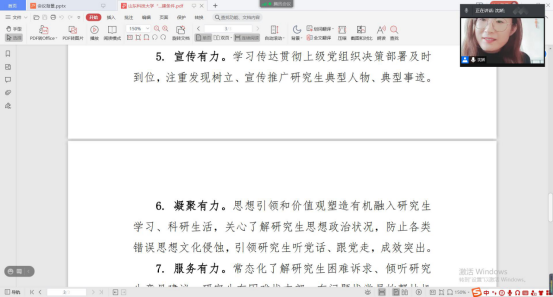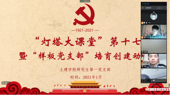 为进一步规范党支部的组织生活,提高支部党员的理论学习水平,深入推进“研究生样板党支部”的培育创建工作,确保党员队伍放假“不掉线”。1月28日下午,beat365官网研究生第一党支部通过腾讯会议线上召开支部大会,集中组织学习了“灯塔大课堂”第十七讲,并就“研究生样板党支部”的创建工作作了动员,研究生第一党支部全体党员、学工办老师沈娇及部分入党积极分子代表参与了本次会议,会议由党支部书记韩一鸣主持。