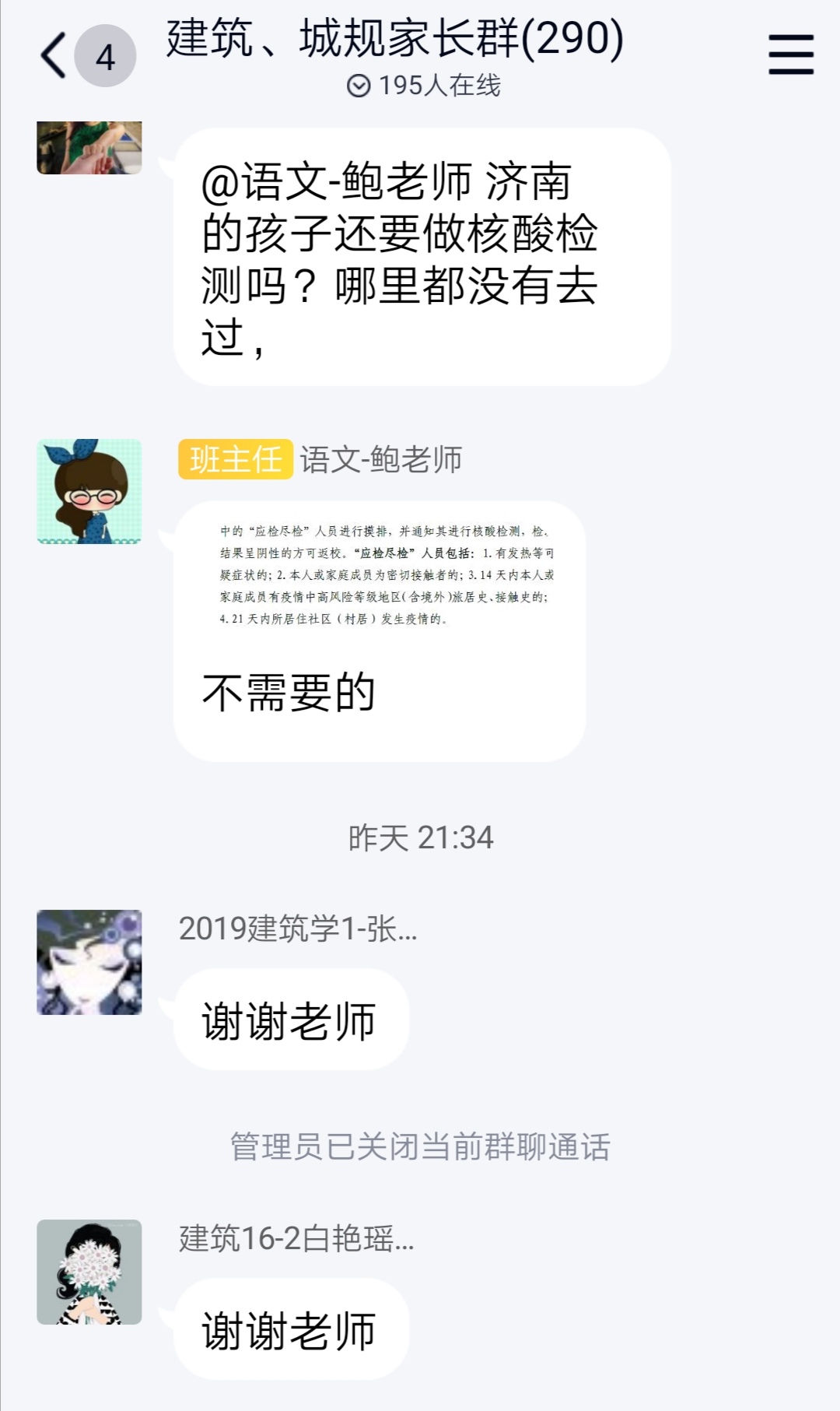 首先,鲍娜娜针对首次家校会议作出相关部署,并向家长们详细介绍近年来建筑学与城乡规划专业的发展与学生动态,使学生家长更好的了解学生校园生活以及对学生的未来规划。同时,为确保2020年秋季学期学校全面复学复课,开学工作平稳有序,鲍娜娜向家长们讲解了秋季学期开学前有关工作的相关事宜,如返校师生员工重点人群摸排与核酸检测工作的运行、全省教育系统疫情防控平台信息填报工作、学生返校工作分期分批有序进行以及相关物资储备和条件保障疫情防控的加强工作等。针对于2019年9月份山东省关于高校学费缴纳办法变动的通知,辅导员向家长们介绍学分制学费分为专业注册与学分收费,其中专业注册学费在每学期初进行收费,提醒家长学生们做好按时缴费工作。