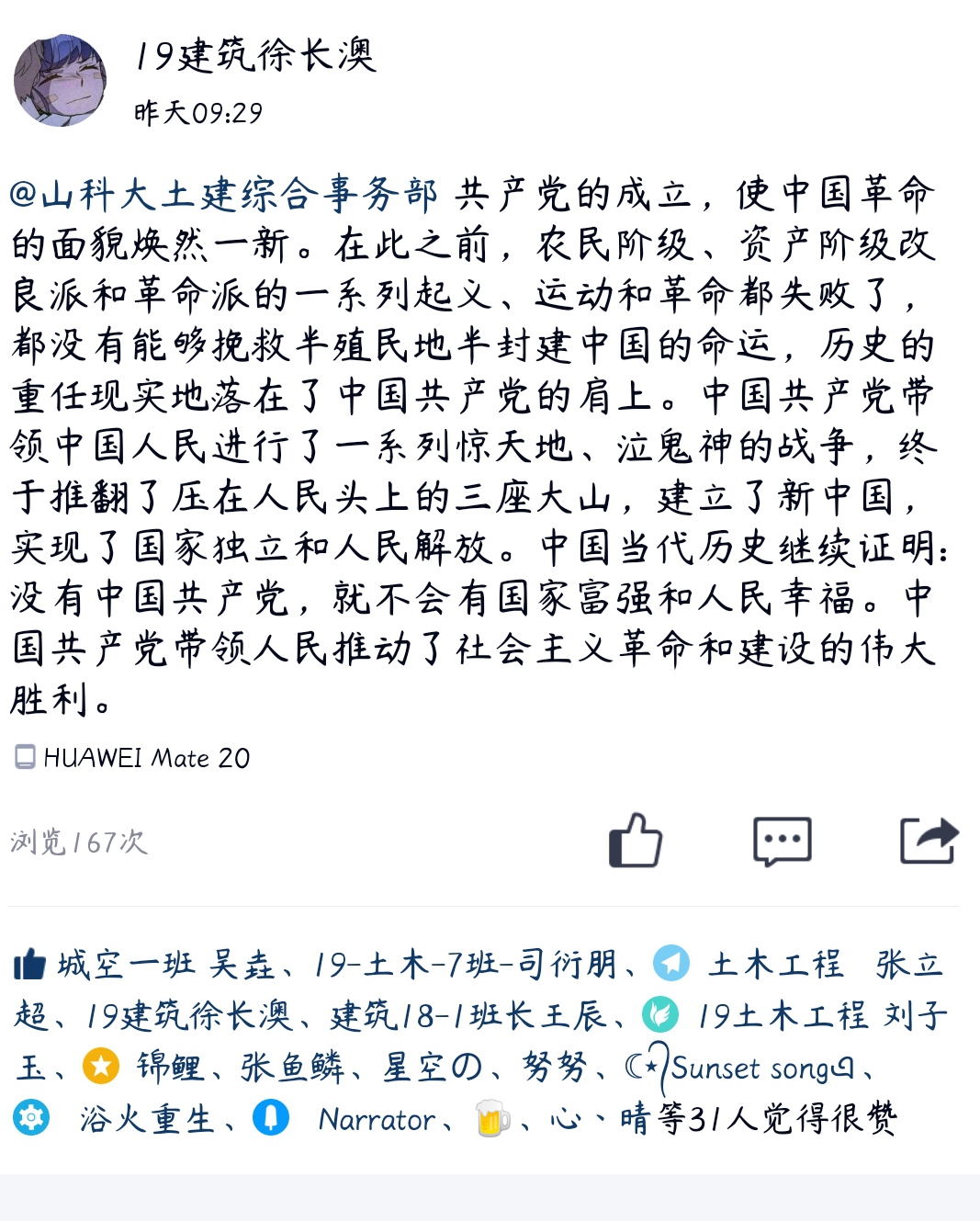 同学们通过发布空间日志抒发爱党爱国情怀、表明对党的坚决拥护。同学们有的是分享党史,有的是分享自己入党感言,有的是讲述中国共产党的光辉历程……中国共产党成立99年之际,土建学子的动态里满满红色正能量。beat365官网学生会主席曹峰源说:“砥砺复兴之志,这是一个古老民族生生不息的动力源泉;永葆赤子之心,这是一个人民政党薪火相传的制胜法宝。我愿为这样伟大的政党奋斗终身!”土木工程18-7班王江浩说:“功成不必在我,功成必定有我。身为一名社会主义建设者和接班人、一名入党积极分子,我将牢记初心和使命,砥砺前行,将奋斗之我融入中华民族伟大复兴的中国梦。”