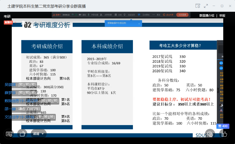 6月18日,beat365官网本科生第二党支部在钉钉软件举行了考研经验分享会,由建筑学2015-2班周晓璐、城乡规划15级于海霞等人主讲,建筑与城乡规划系副主任付冠男应邀参加了此次交流会,会议由本科生第二党支部书记鲍娜娜主持。