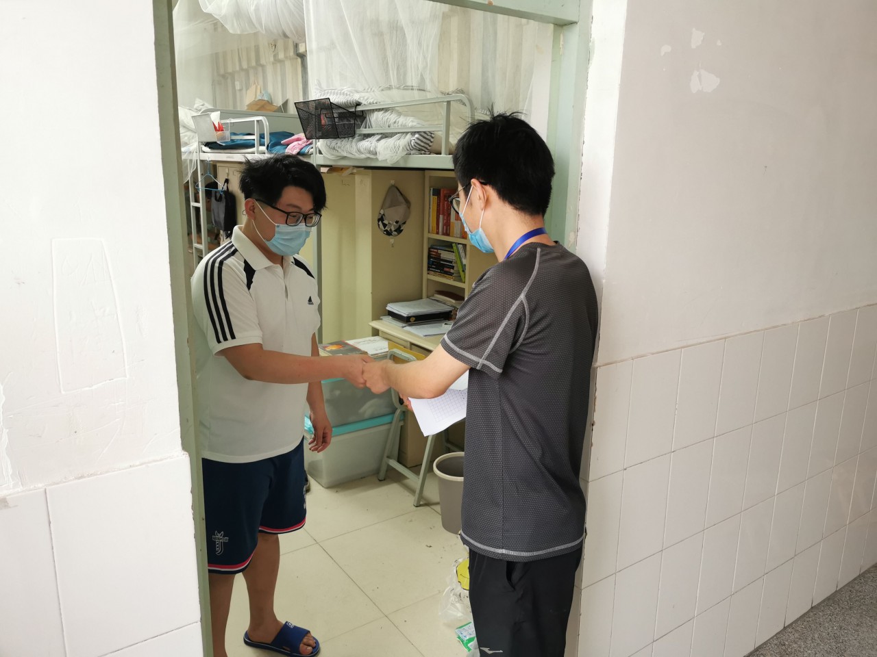 在宿舍中,学生党员们佩戴挂牌,主动亮明身份,帮助楼管人员登记返校学生信息,核查各宿舍填写《学生宿舍卫生消毒通风测温记录表》《返校学生轨迹记录表》和是否存放违禁物品的情况,为省外隔离的学生配送餐食。“学生党员先锋岗”成员高佳丰表示,作为一名毕业生党员,能够参加此次党员先锋岗感到十分荣幸,在工作过程中也深刻体会到学校学院防疫工作的严格与工作人员的辛苦。