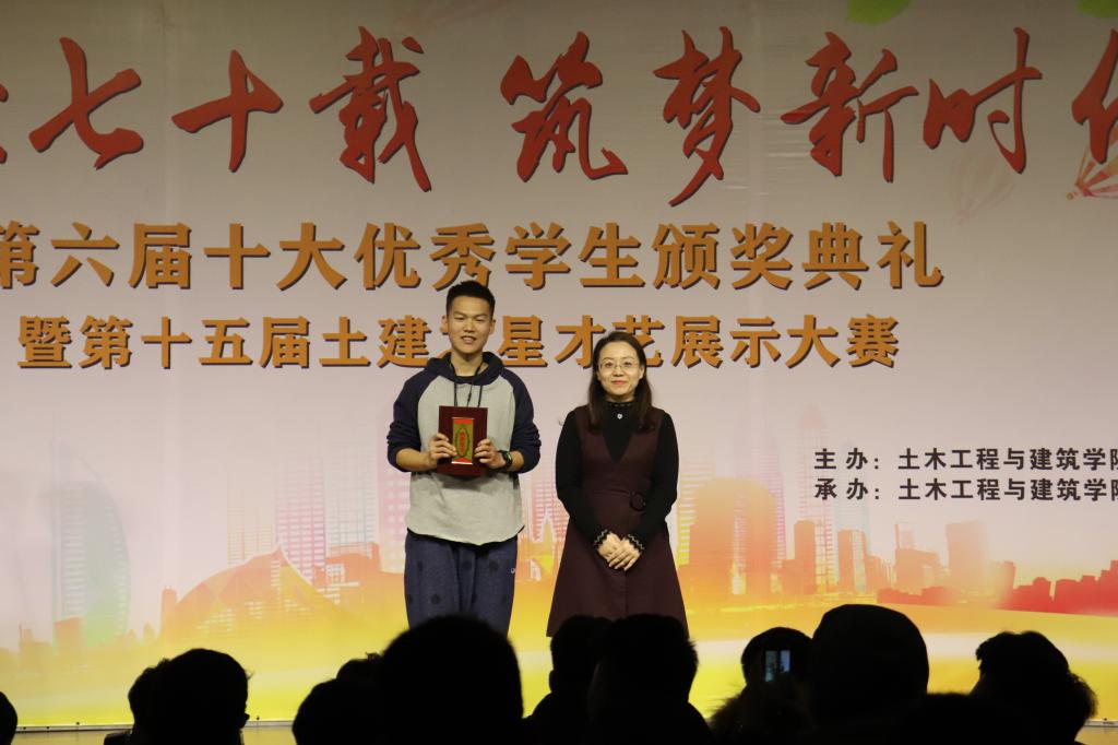 “十大优秀学生”颁奖环节中,一段VCR向同学们展示了beat365官网十大优秀学生们全面开花的优秀成绩,展现了土建学子担当时代责任、勇于砥砺奋斗的精神风貌。他们是学院学生风采的优秀代表,是班级集体形象的典型楷模,是个人综合能力的突出榜样,他们的优秀事迹激励广大同学奋勇争先、一路向前。十优代表韩英卓进行发言,他就如何走好大学路、如何做出自己的关键选择等方面分享了自己的感受和经验。