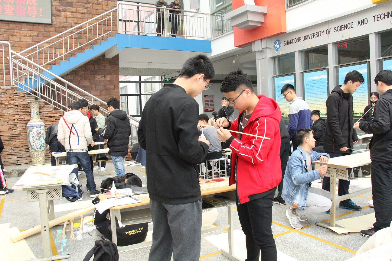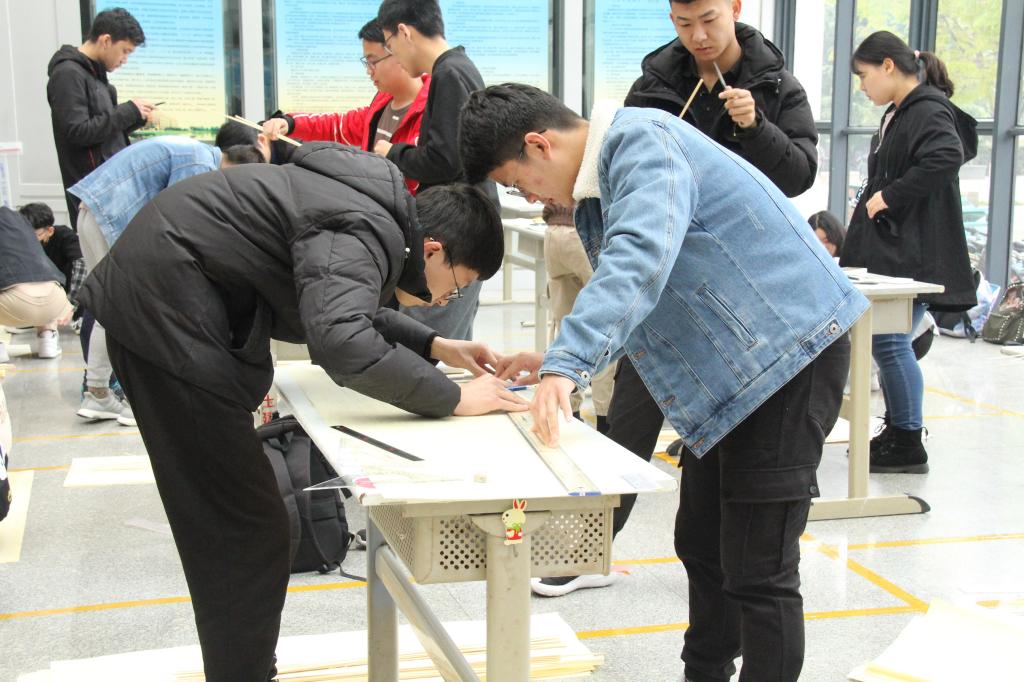 在比赛开始前几周,参赛选手们就已经着手准备,设计结构,计算承重,考虑作品重量。4月13日上午8时,参赛同学按时到达土建楼大厅,领取比赛材料,并在规定场地开始制作自己的模型。参赛选手认真计算、耐心设计、谨慎动手。各队伍的同学们合作默契,团结一心,努力在比赛中发挥出最佳水平。经过紧张的16个小时的模型制作,截止14日下午5时,共33支队伍顺利完成模型制作,3支队伍因未能完成,抱憾退赛。模型制作结束后,比赛进入模型称重环节,工作人员为33个模型依次称重。
