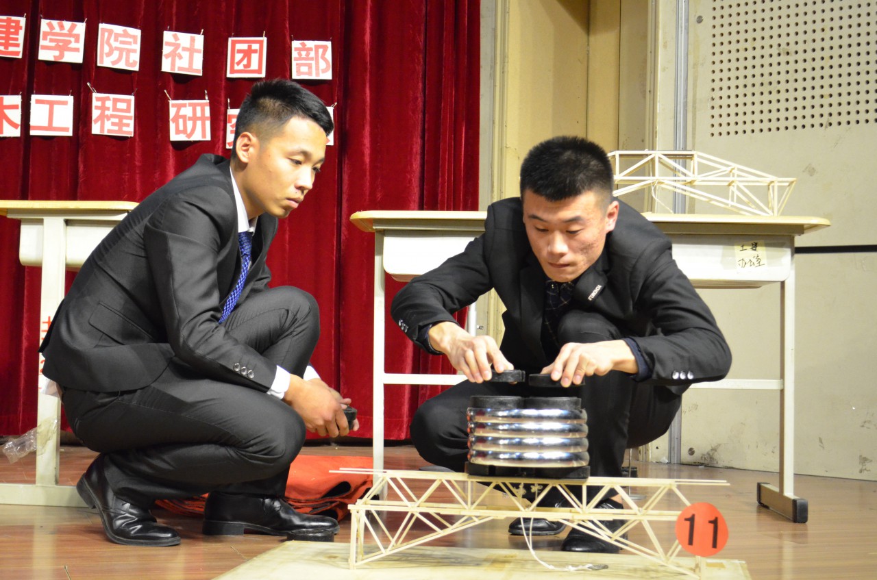 比赛伊始,副院长王崇革教授做开场讲话,介绍了学院科技创新工作,并对同学们提出了几点期望。随后,比赛正式拉开帷幕,进入决赛的22组选手进行了现场作品展示以及加载。首先,进行的是非专业组的创意模型展示。本次非专业组比赛以学校游泳馆设计为命题,各组选手充分发挥自己的“匠心”,因地制宜,充分考虑风向、气候等情况,结合自己的专业知识,同时充分践行绿色建筑概念,设计出一个个既造型独特、别具一格又注重建筑结构的作品。现场评委老师细心观察选手作品,积极讨论各位选手模型细节及合理性。紧接着,进行了专业组桥梁设计展示。每组桥梁模型都进行了承重测定,工作人员在桥梁模型的通车部位进行静荷载和冲击荷载的试验。评委们针对每组的作品进行提问,并提出优化建议,进一步考验了选手们的专业知识,各位选手均获益匪浅。最后,李松辉和周同两位老师分别针对本次大赛的专业组和非专业组进行了点评。两位老师对同学们的作品表示赞赏,同时也指出应不断学习专业知识,在比赛和实践中将专业能力与创新能力相结合。