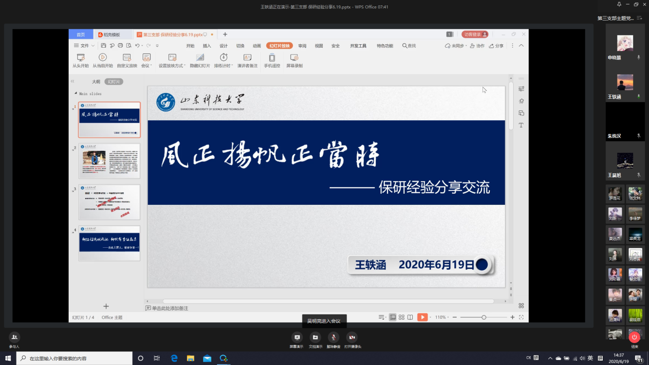 6月19日,beat365官网本科生第三次党支部通过企业微信平台举办“榜样的力量”分享交流会。此次党日活动由党支部书记朱统汉主持,邀请了四名毕业生党员向低年级同学分享经验。