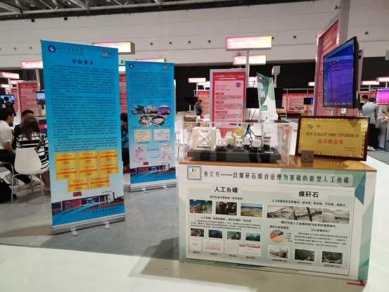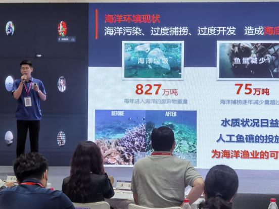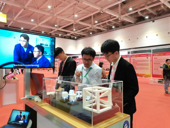 “鱼立方”项目团队成员在项目展区向前来参观的观众介绍项目内容,展示人工鱼礁3D打印模型和材料样本,细致全面地讲解“鱼立方”项目的出发点和创新点。在展示项目成果的同时,成员们积极与其他高校参展学生交流互动,彼此学习分享创新创业经验。