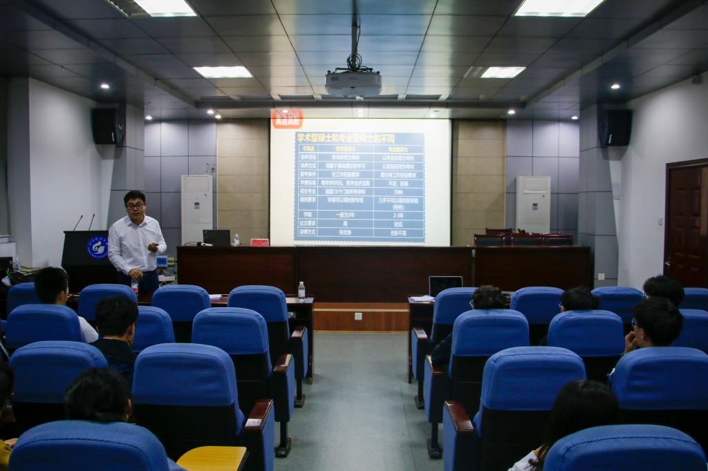 顾昊以“什么是考研”“为什么要考研”为切入点,对当下考研形势、招考趋势进行了深入分析,并通过身边诸多事例引导同学们树立平台意识,将考研作为提升个人平台的有效途径。他通过列举真实案例与学生进行现场交流,生动讲述了考研过程中所作选择的利与弊,梳理了报考院校时应该考虑的种种事项。随后,他围绕“考研时间表”“专业院校选择五步骤”“复习规划时间轴”三个方面进行了专业的分析与科学的计划,引导学生有目标、有方向地进行报考选择。他认为,既然选择考研,就不要三心二意,或是轻言放弃;要坚定信心,持之以恒,勇敢的为自己搏一搏;要相信自己,有志者事竟成。