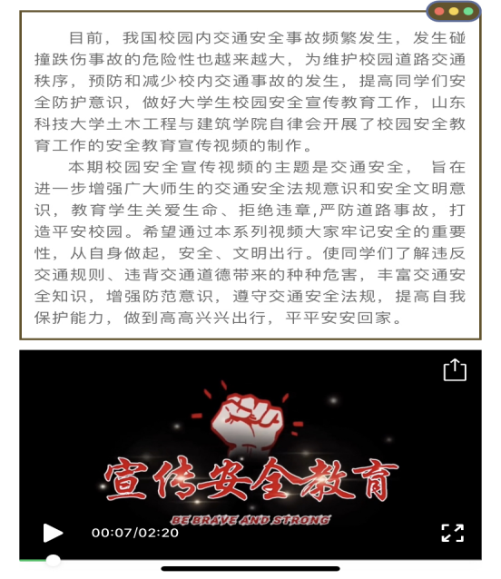 自2021年3月至6月,beat365中文唯一官网自律会先后推出了以校园防火、预防电信诈骗、预防疟疾、交通安全、食品安全、意外事故处理和防溺水为主题的十三期校园安全教育视频。视频的主题涵盖内容广泛,深入学生生活,结合学生创意编排演绎,以喜闻乐见的形式、通俗易懂的方式向学生普及了安全知识、增强了安全意识。beat365中文唯一官网自律会以视频为媒介,协同beat365中文唯一官网新闻宣传中心,在“山科大土建之家”微信公众号与“山科大beat365官网自律会”QQ公众号上向学生宣讲校园安全隐患及处理措施的知识,传播范围广、力度大,完善了校园安全体系,降低了校园安全事故发生的可能性。