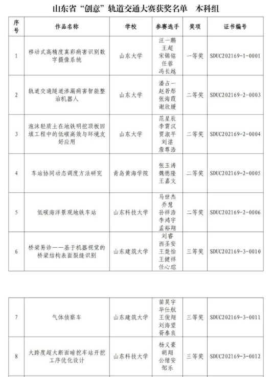 两支队伍在老师的精心指导下将参赛作品不断优化,最终取得令人满意的成绩。本次山东省“创意”轨道交通大赛加深了同学们对专业理论知识的认识理解,同时锻炼学生的创新能力、设计能力和团队实践能力。