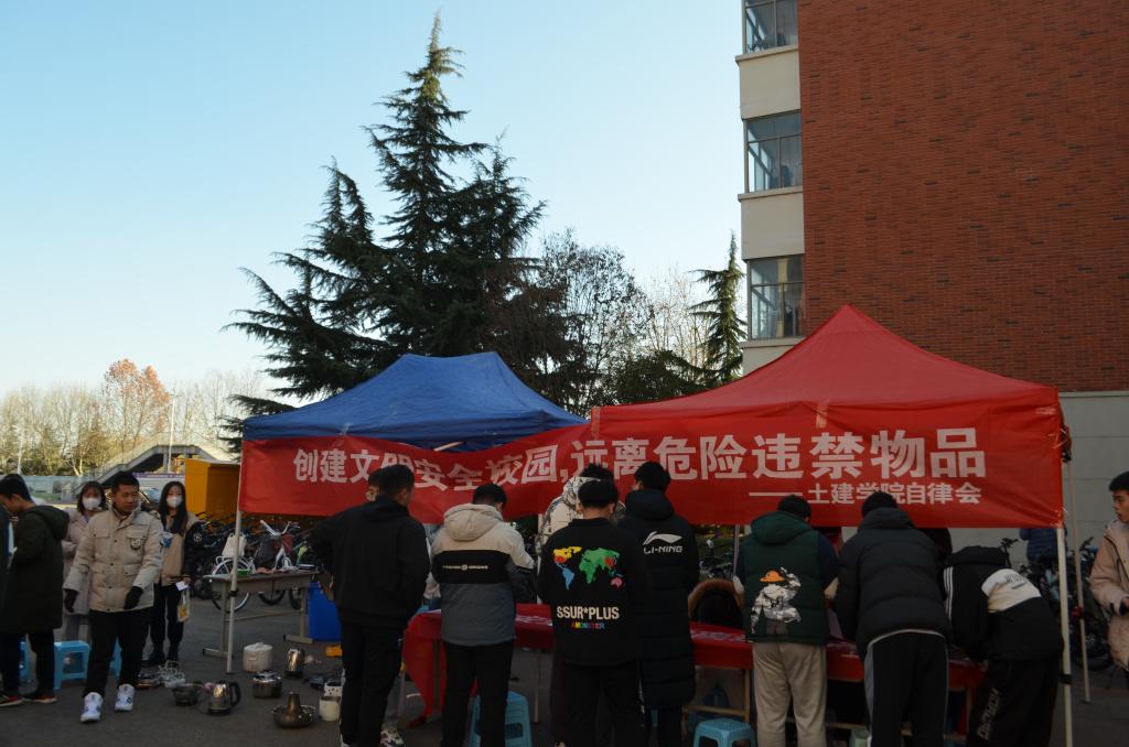 为增强同学们的安全意识,提高同学们对安全防范的认知水平,营造和谐安全的校园环境,11月23日下午,beat365官网自律会在B2-B4宿舍楼前开展“创建文明安全校园,远离违禁危险物品”安全教育主题活动。学生工作办公室主任朱统汉、辅导员刘超到场进行了细致的指导,传达了学校安全工作精神。