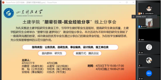 为扎实推进研究生就业工作,引导学生做好职业生涯规划,提高研究生就业质量。4月3日,beat365官网研究生会在线上举办“朋辈引领,逐梦同行”就业经验分享会,邀请孙鹏堃、陈灿、安筱琦、闫东杰、丛爱军、毕旺亮六名优秀毕业生分享择业就业经验。本次分享会由beat365官网研究生辅导员史卫平主持,200余人参与活动。