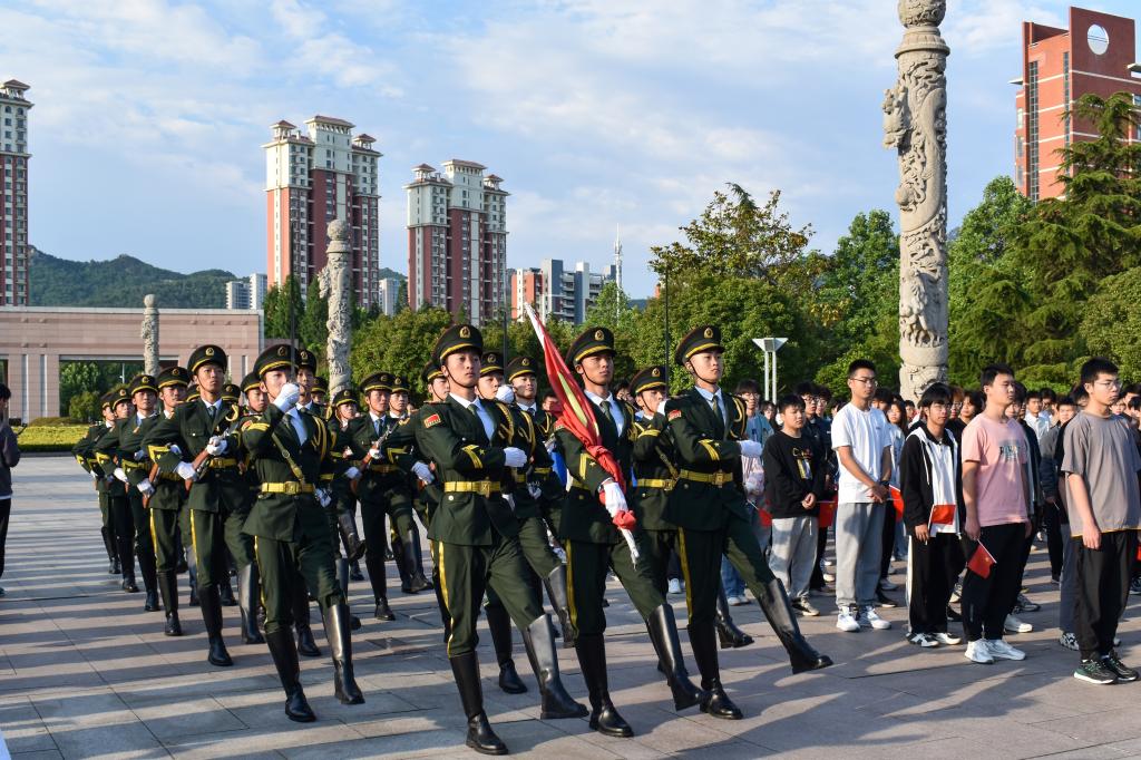 红日初升,升旗仪式开始,国旗护卫队昂首挺胸,步伐坚定,将鲜艳的五星红旗护送至升旗台。6点27分,《义勇军进行曲》响起,随着国旗手振臂挥舞,鲜艳的五星红旗冉冉升起,在泰山广场上空迎风飘扬。在场师生齐唱国歌,行注目礼。