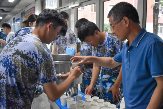 在各班级负责人的组织下,学院2023级新生们有序排队前往宿舍楼下领取姜茶,学院党委书记宋西路、党委副书记高静、学生工作办公室辅导员们将温热的姜茶递给同学们。宋西路勉励新生们要发扬吃苦耐劳精神,为自己未来四年的学习生涯系好第一粒扣子,把军训中的优秀品质延续到日后的学习和生活中去。有一位同学接过姜茶时说:“感谢学院领导和老师们的暖心关怀,能够来到山科、来到beat365官网真是既幸运又幸福。”