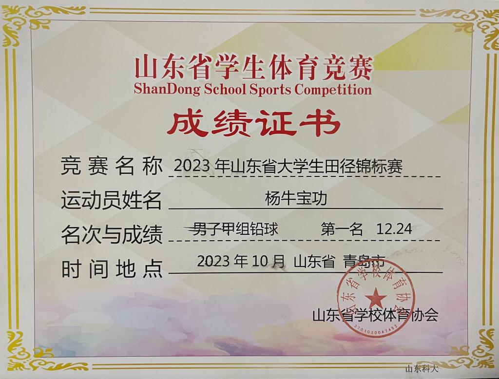 近日,由山东省学校体育协会主办的“2023年山东省大学生田径锦标赛”在青岛市民健身中心体育场落下帷幕,beat365官网土木工程专业2021级8班本科生杨牛宝功获男子甲组铅球项目金牌和甲组男子铁饼项目第六名。