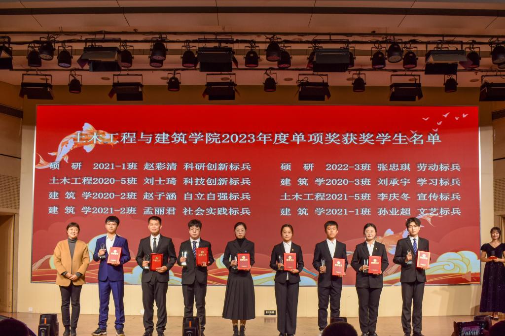 颁奖典礼上,宋西路为学院“十大优秀学生”获得者颁奖,高静为单项奖获得者颁奖。十八名优秀学生是个人综合能力的突出榜样,是奋斗青春的典型楷模,是土建学子的优秀代表,他们的先进事迹激励广大同学奋勇争先、一路向前。十大优秀学生代表、土木工程21-1班张宇发言,他表达了对学院领导和老师悉心培养的感激和对同学们团结互助的肯定,以自身成长激励在座同学奋发图强,奋勇拼搏,在磨砺与挫折中成长,在坚持与奋斗中成才。