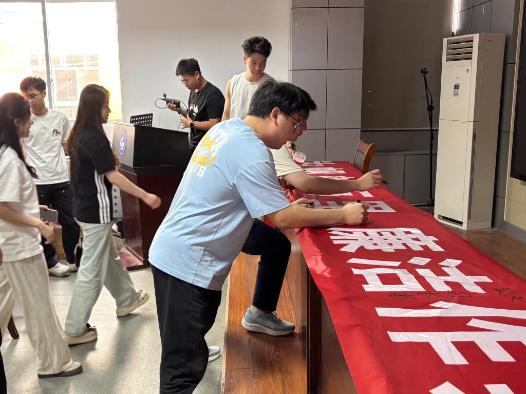 讲座最后,参会人员集体起立,举起右拳,进行庄严宣誓,并在印有“诚信为帆航万里,廉洁作桨启新程”的横幅上签名。“坚守学术诚信,永葆廉洁本色;惟真求新,勤学笃行;牢记历史责任,勇为社会栋梁;心怀国之大者,担当时代重任!”的誓言掷地有声,随着铮铮誓言和笔触落下,本次讲座的精神感召力完成了从理念到行动的升华。