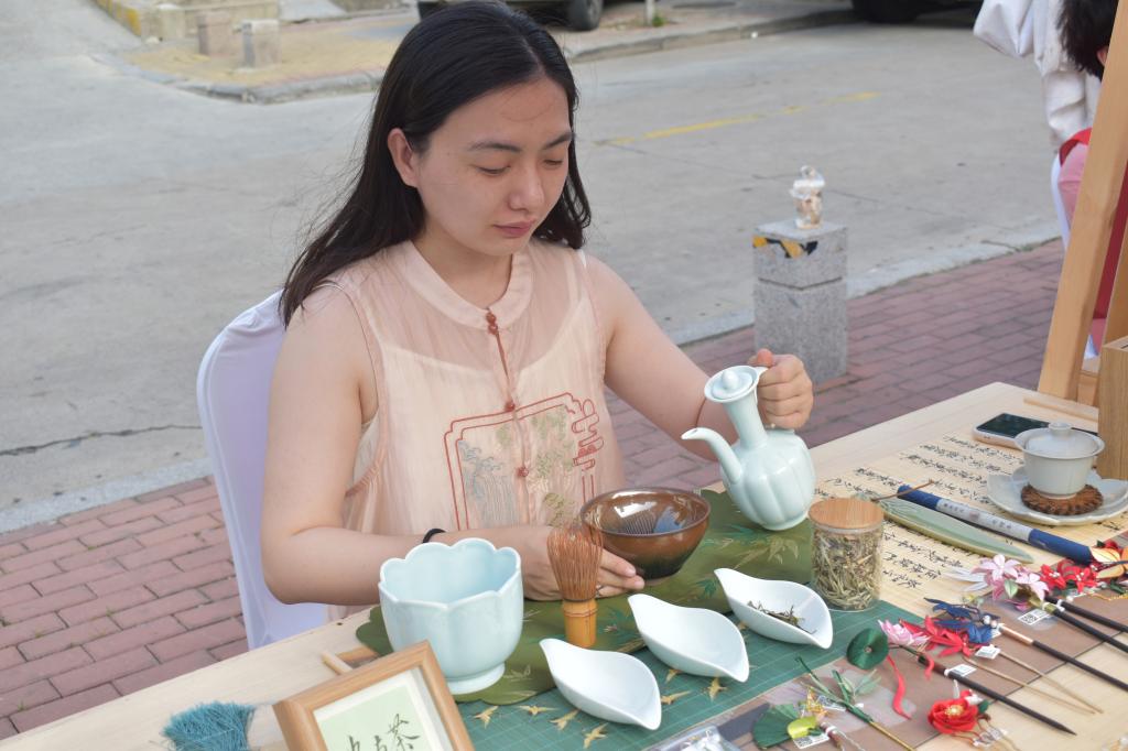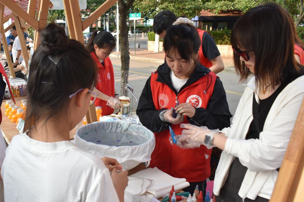 活动现场,漆扇工艺展位前,非遗传承人耐心讲解着“三涂九染” 的古老技法,学生们跟随讲解,小心翼翼地握着画笔,在扇面上勾勒出简单的云纹。青瓷茶具在茶盘上排列有序,同学们正跟着志愿者们学习,一步步体验乌龙茶的冲泡流程:温杯、置茶、注水、出汤,每个动作里都透着好奇。这些传统工艺不仅具有观赏价值,更蕴含着深厚的文化内涵,让同学们在轻松愉悦的氛围中,真切感受到了传统文化的独特魅力。