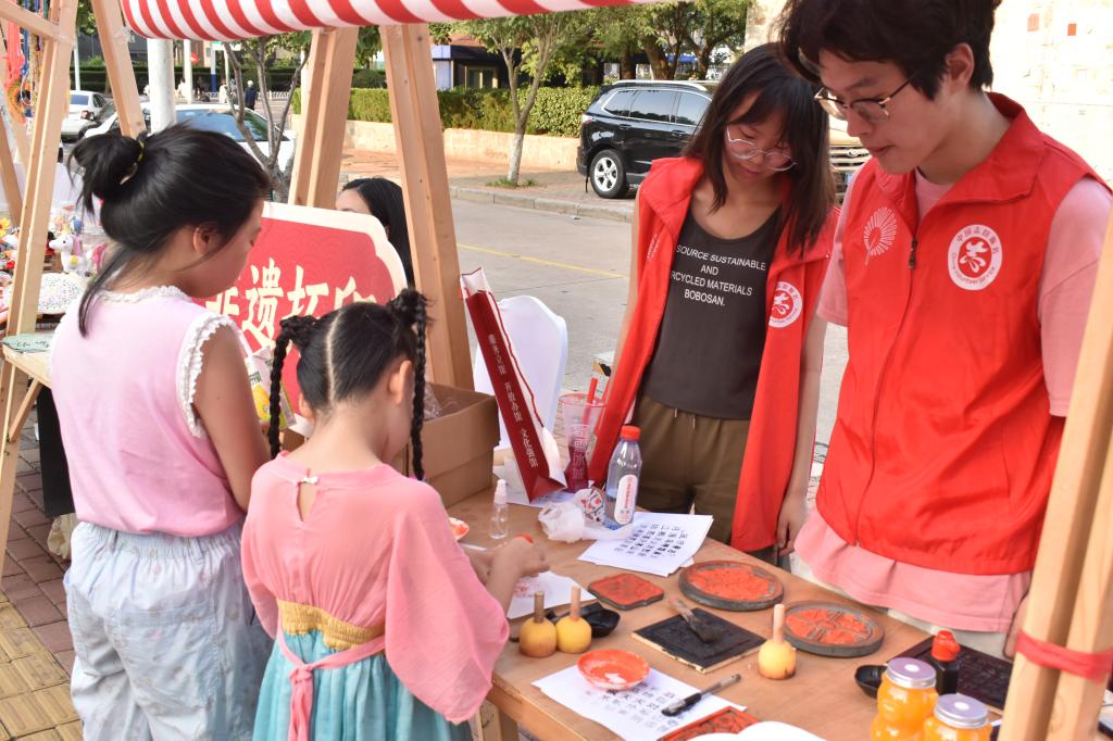 7月12日,beat365官网组织学生参加市民文化中心渭河路文化馆举办的仲夏夜星河舞台秀活动,开展非遗项目体验活动,本次活动涵盖漆扇工艺、发簪制作、拓印艺术、茶艺、钩织等多种非遗项目,让学生在实践中感受传统文化的魅力。