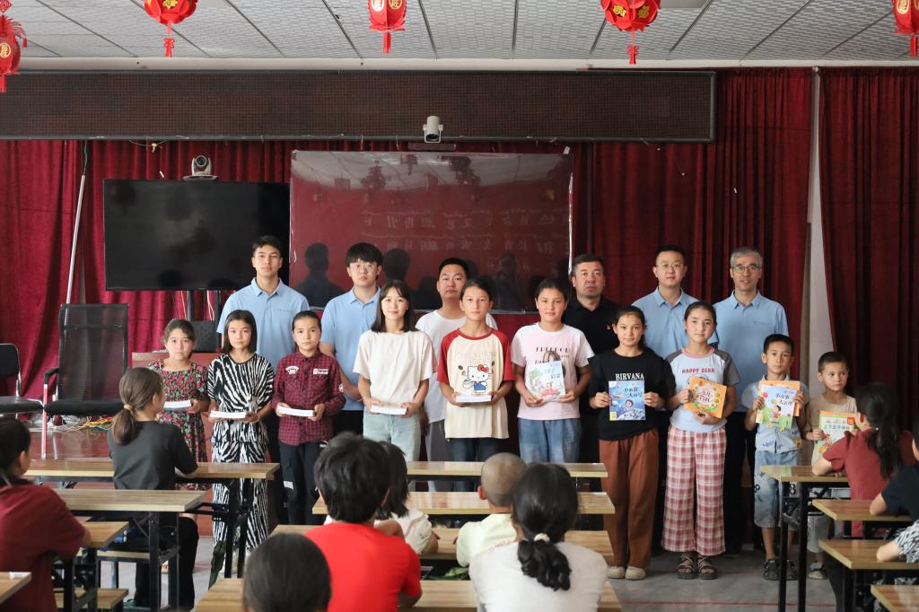 在拜合提村,实践队成员们与村民共同参加庄严的升国旗仪式,凝视五星红旗冉冉升起,强烈的国家认同感与民族自豪感在每个人心中激荡升华。升旗仪式后,实践队精心组织开展了“文化润疆”活动,队员们向村里儿童赠送了《唐诗三百首》《中华上下五千年》等承载中华优秀传统文化精髓的书籍,并耐心细致地开展课业辅导及讲解象棋、五子棋等中国传统棋类的规则和技巧。