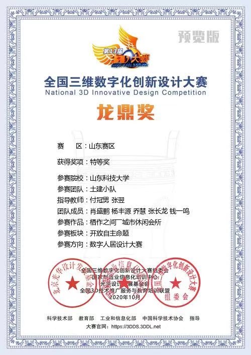 2020年10月,由肖盛鹏、乔慧、杨丰源、张长龙和钱一鸣同学组建的土建小队,在付冠男和张翌老师指导下获得全国第十三届三维数字创新设计大赛山东省特等奖并获得国赛资格。参赛作品名为“栖作之间-城市休闲会所”,参赛方向为数字人居设计。本次作品综合运用BIM、Revit、Lumion、Navisworks、AE,实现建筑设计、建筑渲染、模拟施工动画、BIM+VR全景漫游的多样化成果展示,并将绿色建筑和装配式建筑设计理念与中国传统建筑设计元素充分结合。