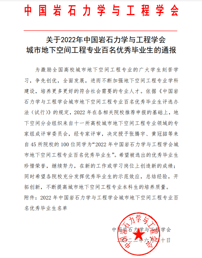 中国岩石力学与工程学会自2016年起在全国高校城市地下空间工程专业开展评选优秀毕业生活动。评选七年来,全国累计共有393名学生被评为全国高校城市地下空间工程专业优秀毕业生,我校共有7名学生获此殊荣,反映了社会对我校城市地下空间工程专业本科生培养质量的高度认可。