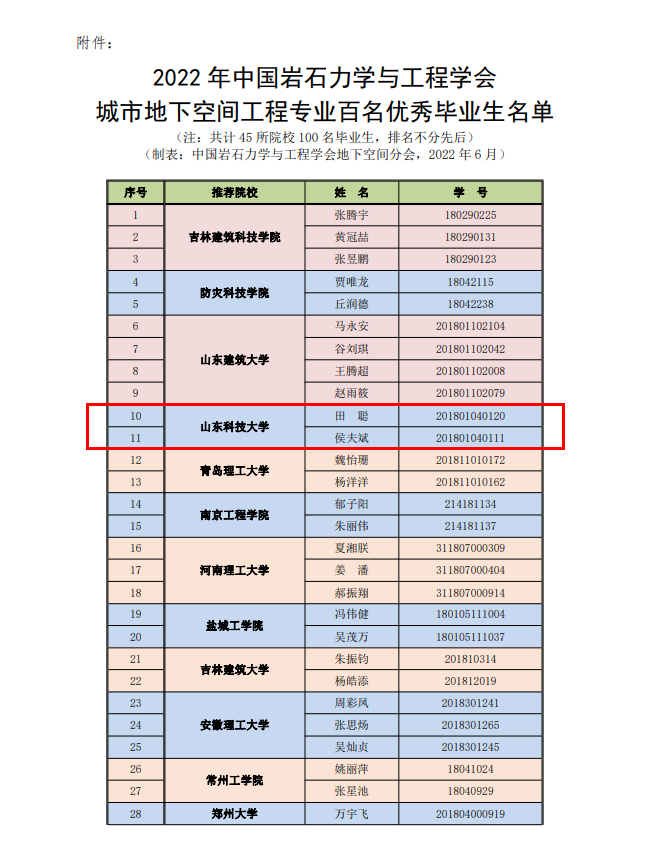 近日,由中国岩石力学与工程学会举办的2022届全国高校城市地下空间工程专业百名优秀毕业生评选活动落下帷幕。beat365官网城市地下空间工程专业2022届毕业生田聪、侯夫斌同学荣获“全国高校城市地下空间工程专业百名优秀毕业生”称号。
