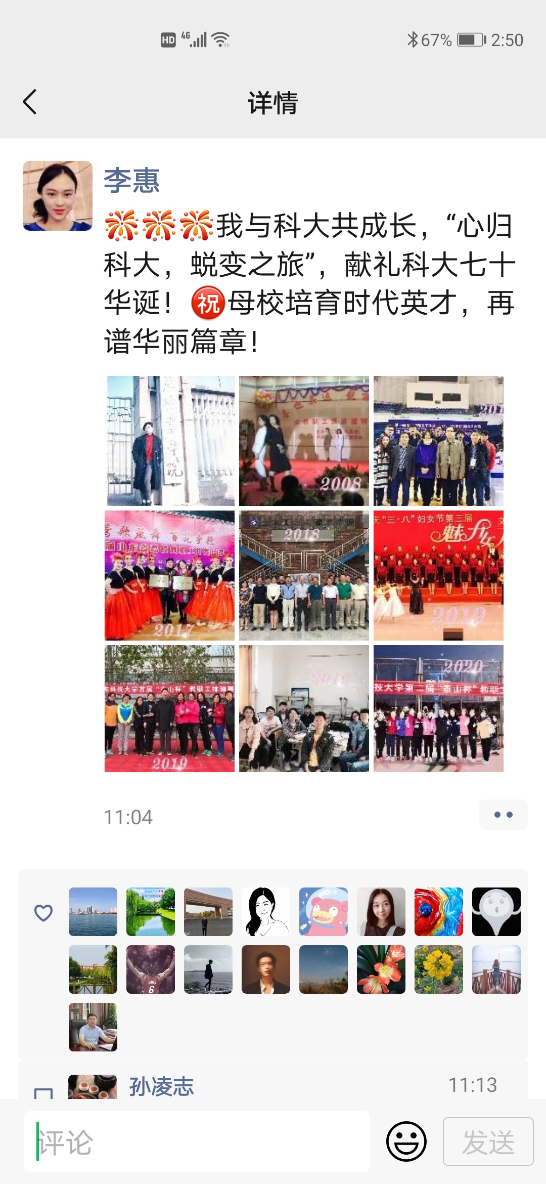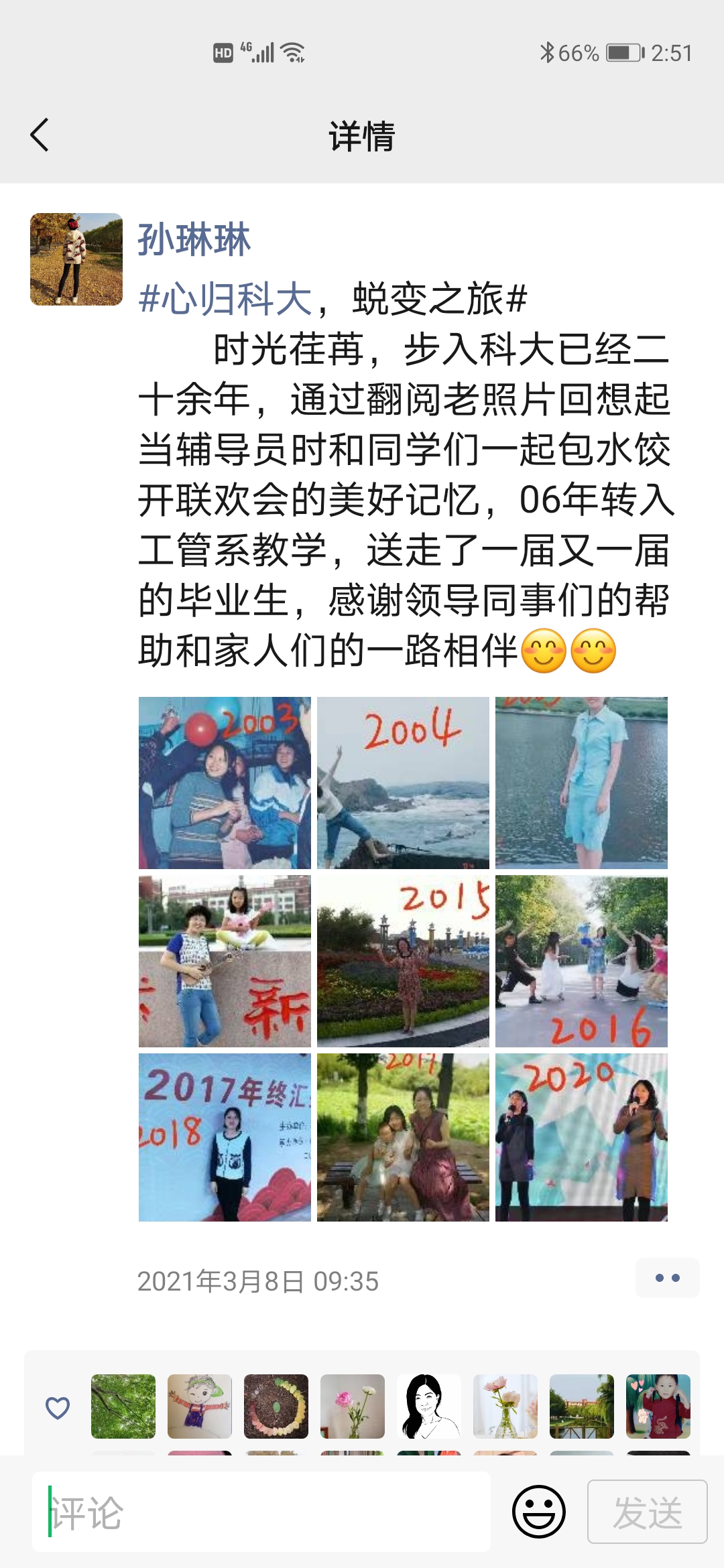 学院女教职工整理自入职科大以来个人或者学校景物的变化照片,按照年份顺序发送朋友圈,配上含有“#心归科大,蜕变之旅#”的心路历程。四季更替,岁月沉淀,女教职工在科大逐渐蜕变成蝶。教苑群芳,女教职工讲台上做最美园丁,传道授业,讲台下是百变女神,绽放魅力。